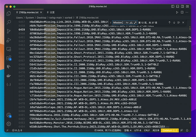 如上图:文档每一行都是一条完整的 BT 磁力链接,格式以 magnet:?xt= 开头,&dn= 后面跟着的就是资源文件名。比如我想找《碟中谍》电影,搜索其英文名 Mission.Impossible 即能找到(空格用英文句号代替)。