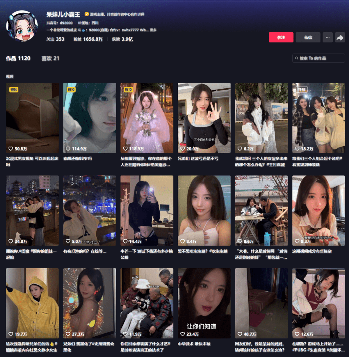 她搞笑神经的直播风格,加上靓丽的外表有种反差的可爱与率真深受广大观众喜爱,外界人称”天才吃鸡少女”!